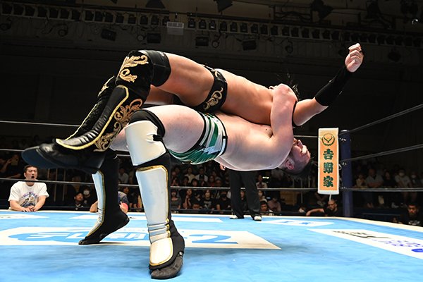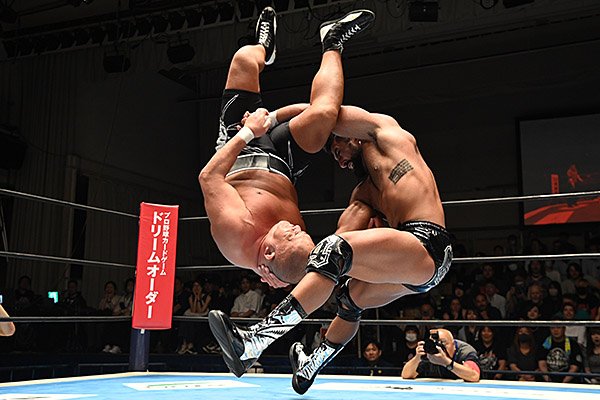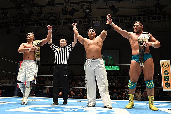 3. Yuya Uemura y Ryusuke Taguchi vencieron a Great-O-Khan y Jacob Austin Young (7:37) con un Diving Body Attack de Uemura sobre Young.