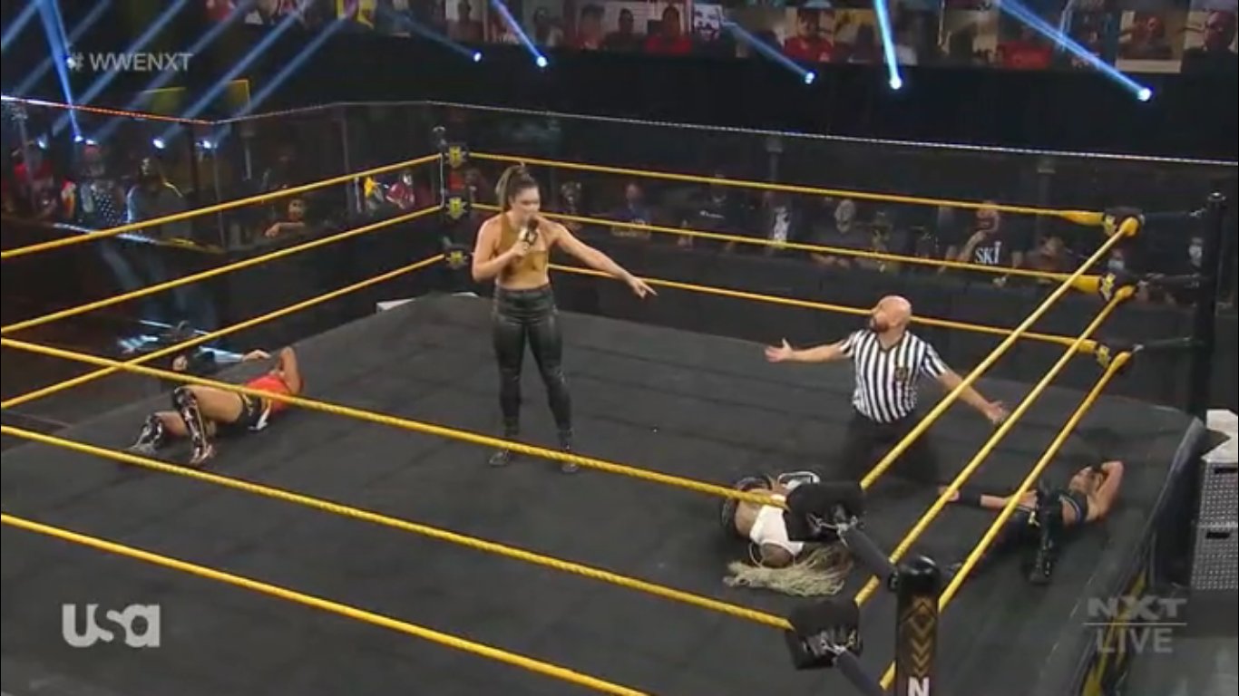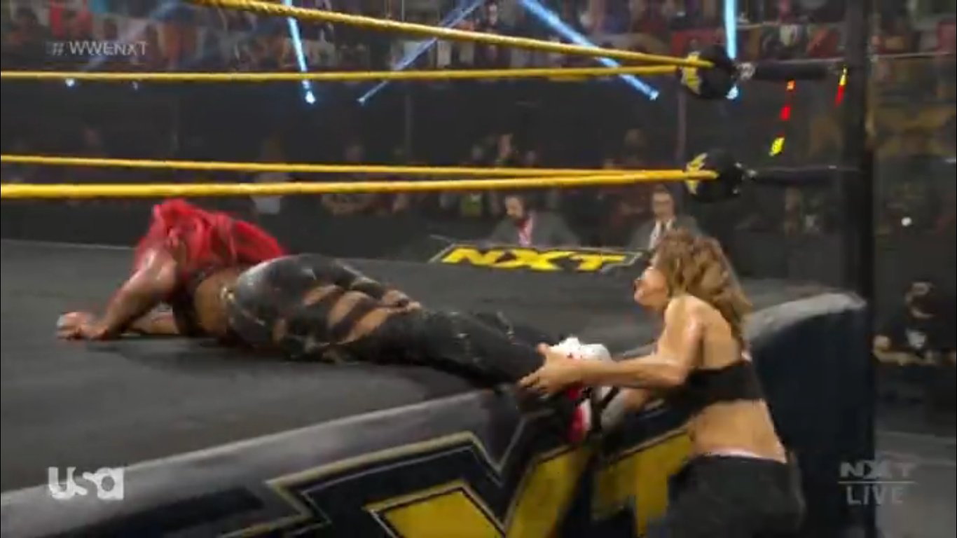 Moon no tiene tiempo para celebrar, ya que Dakota Kai aparece por detrás y la ataca. Puede surgir una buena lucha de aquí.