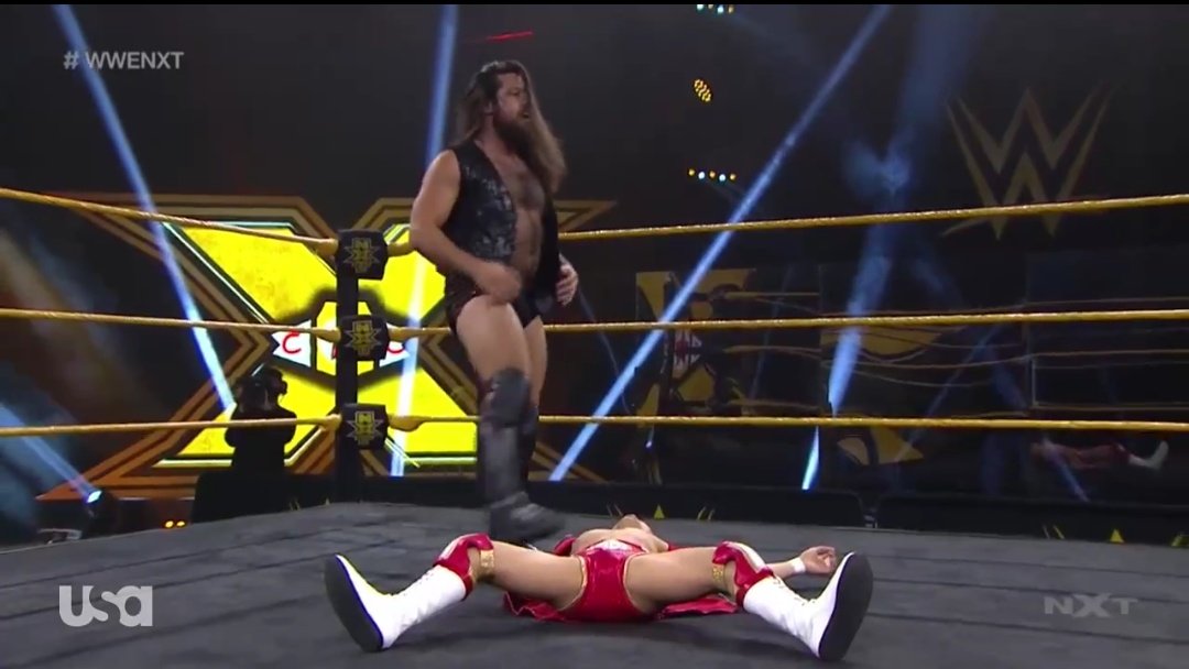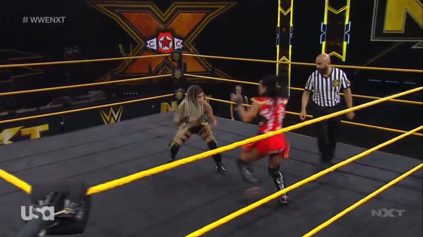 Shirai consigue un rompecaras y un dropkick. Va por el doble rodillazo, pero Gargano interfiere. Priest hace lo propio y le conecta una patada, derribándolo.