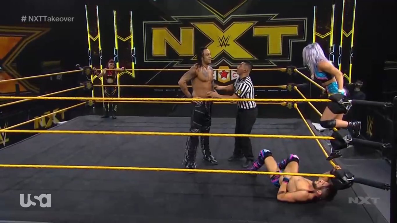 LeRae falla un Moonsault y Shirai le aplica un Backbreaker. La campeona NXT va por el Moonsault, pero Gargano interfiere y salva a su esposa. Priest aparece y conecta el Bellclap. Shirai conecta el Moonsault y cede el relevo a Priest.