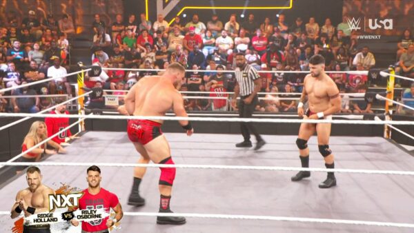 Holland estaba a punto de golpear con una escalinata a su rival, pero Thea Hail le pidió que no lo hiciera. Esto hizo que Ridge se distrajera y fuera castigado con fuertes ataques; sin embargo, Holland sorprendió derribando a Osborne y luego le conectó un poderoso DDT para llevarse el combate.