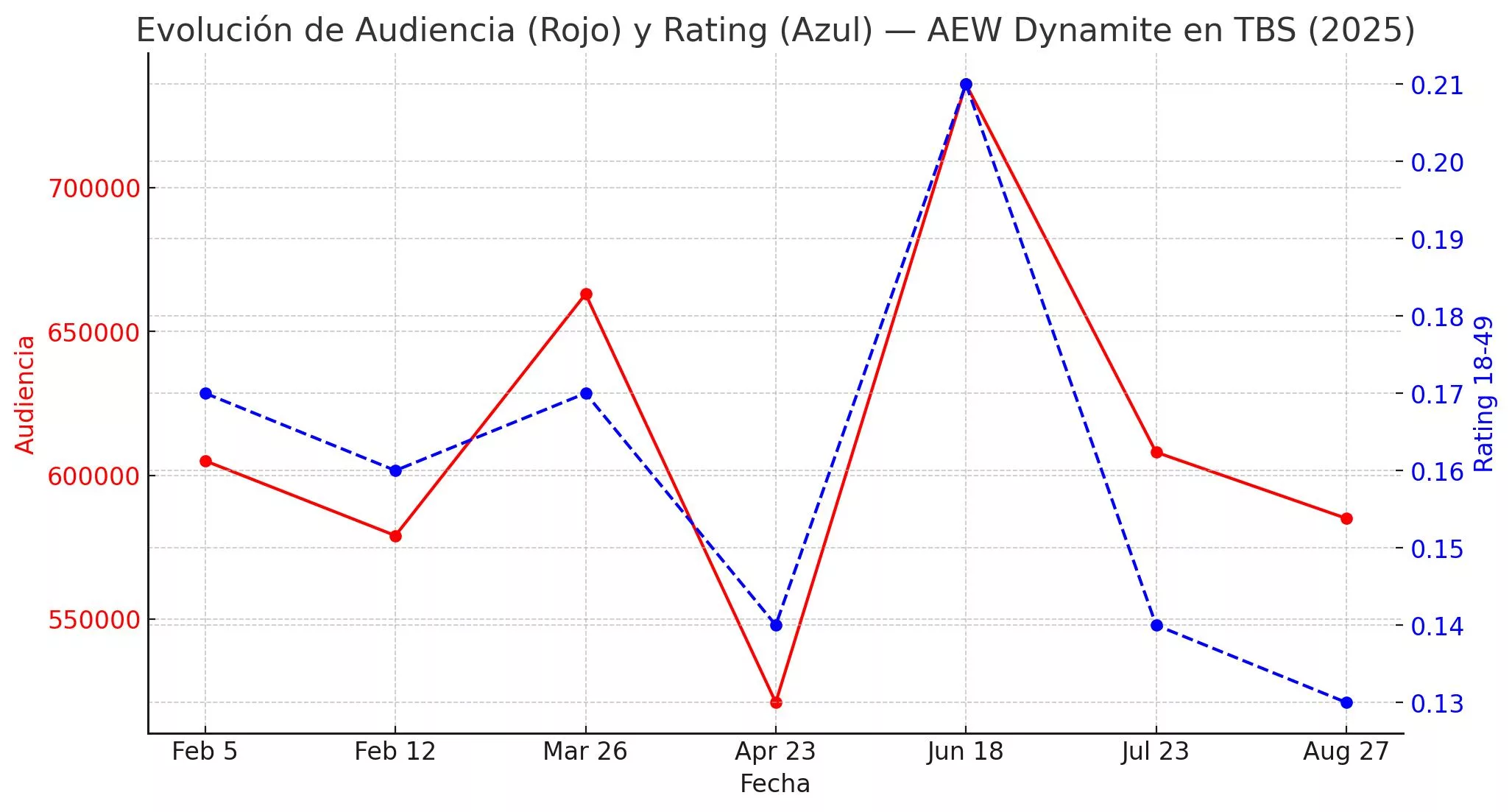 El año pasado por estas fechas, el 20 de noviembre de 2024, Dynamite atrajo a 640.000 espectadores y una audiencia de 0,20 (para la categoría de 18 a 49 años). El episodio del 22 de noviembre de 2023 atrajo a 845.000 espectadores y una audiencia de 0,26.