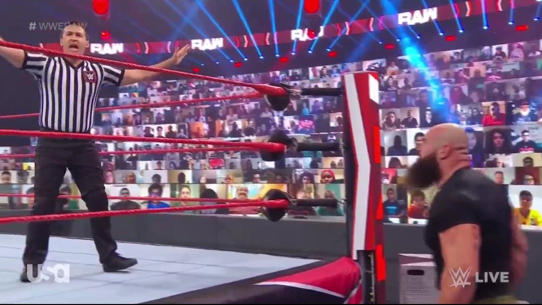 Adam Pearce está en el teléfono y es interrumpido por Braun Strowman, quien quiere una lucha. Pearce le dice que no le puede dar una lucha oficial, sino una de exhibición, pero a Strowman solo le interesa ponerle las manos encima a alguien, y le da igual.