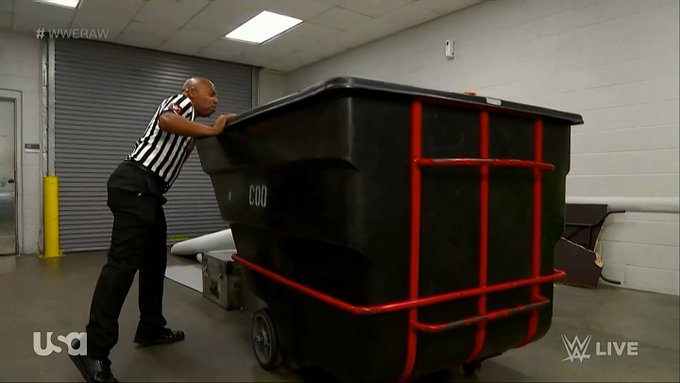 Drew Gulak intenta esconderse con el Campeonato 24/7, pero es sorprendido por R-Truth y un réferi. Tozawa también está dentro de un bote de basura y los tres luchan dentro del contenedor grande.