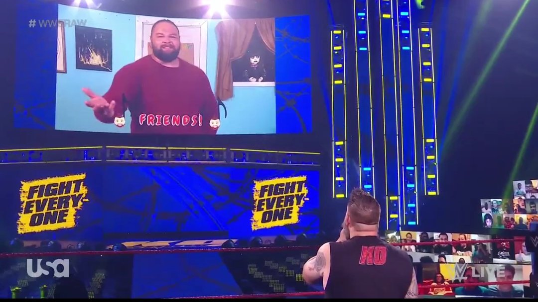Tenemos a Bray Wyatt en la pantalla Firefly Fun House y este saluda a Owens y le dice que es su nuevo amigo. Dice que los amigos siempre están juntos, indistintamente dónde están y Wyatt y sus marionetas cantan una canción. Ramblin Rabbit muere por enésima vez.