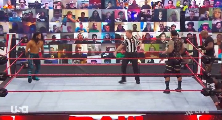Dolph Ziggler y Angelo Dawkins son los hombres legales y este último estaba siendo dominado por el Show Off hasta que llega a su esquina y cede el relevo a Montez Ford, quien logra una cuenta de dos.