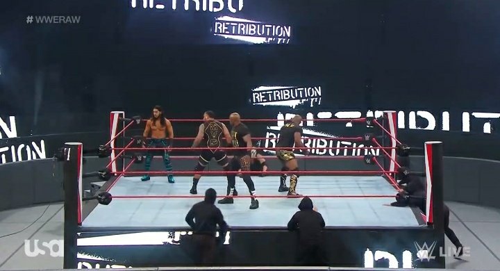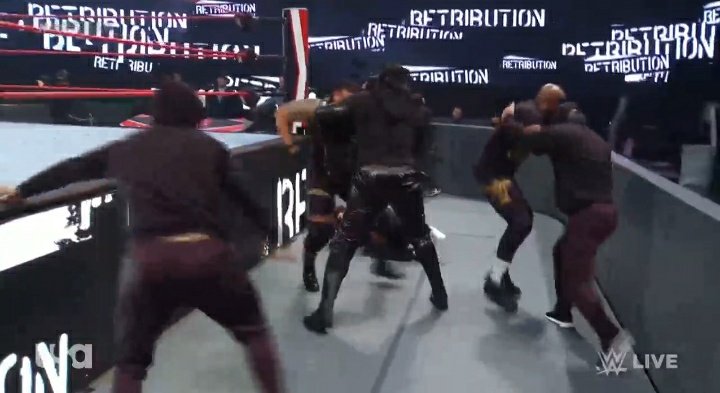 Mustafa Ali envía a MVP afuera del ring con un dropkick, pero este se hartó e ingresa con Lashley y Benjamin y rodean a Ali. Se apagan las luces y el logo de Retribution aparece, y sus miembros rodean el ring.
