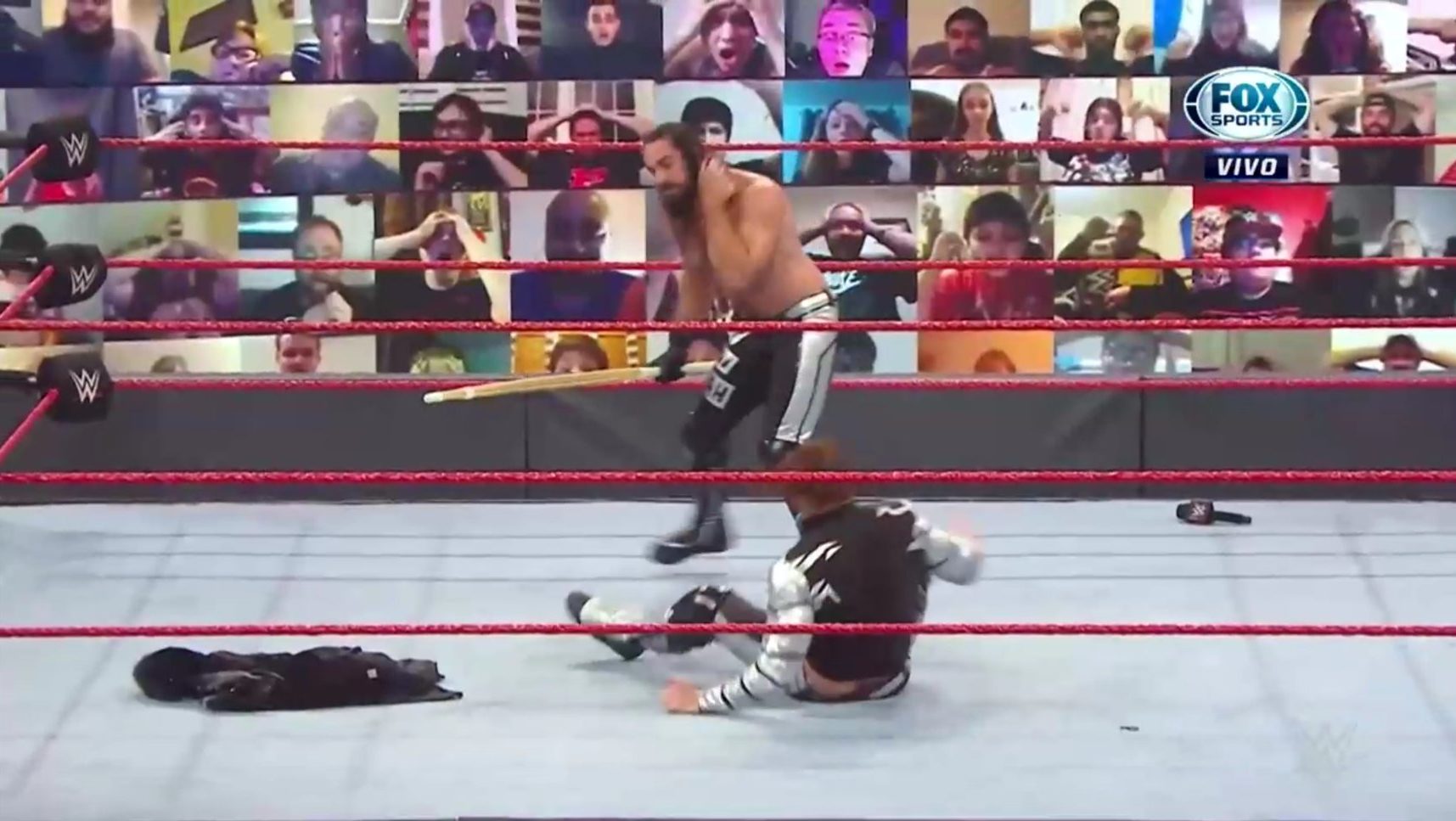 Rollins buscaba atacar con el palo de kendo, pero Murphy se esquiva y lo estrella contra la barrera. Ahora, toma el palo de kendo y es Murphy quien lo castiga. Rollins pide clemencia, Murphy continúa el castigo y le exige que se disculpe.