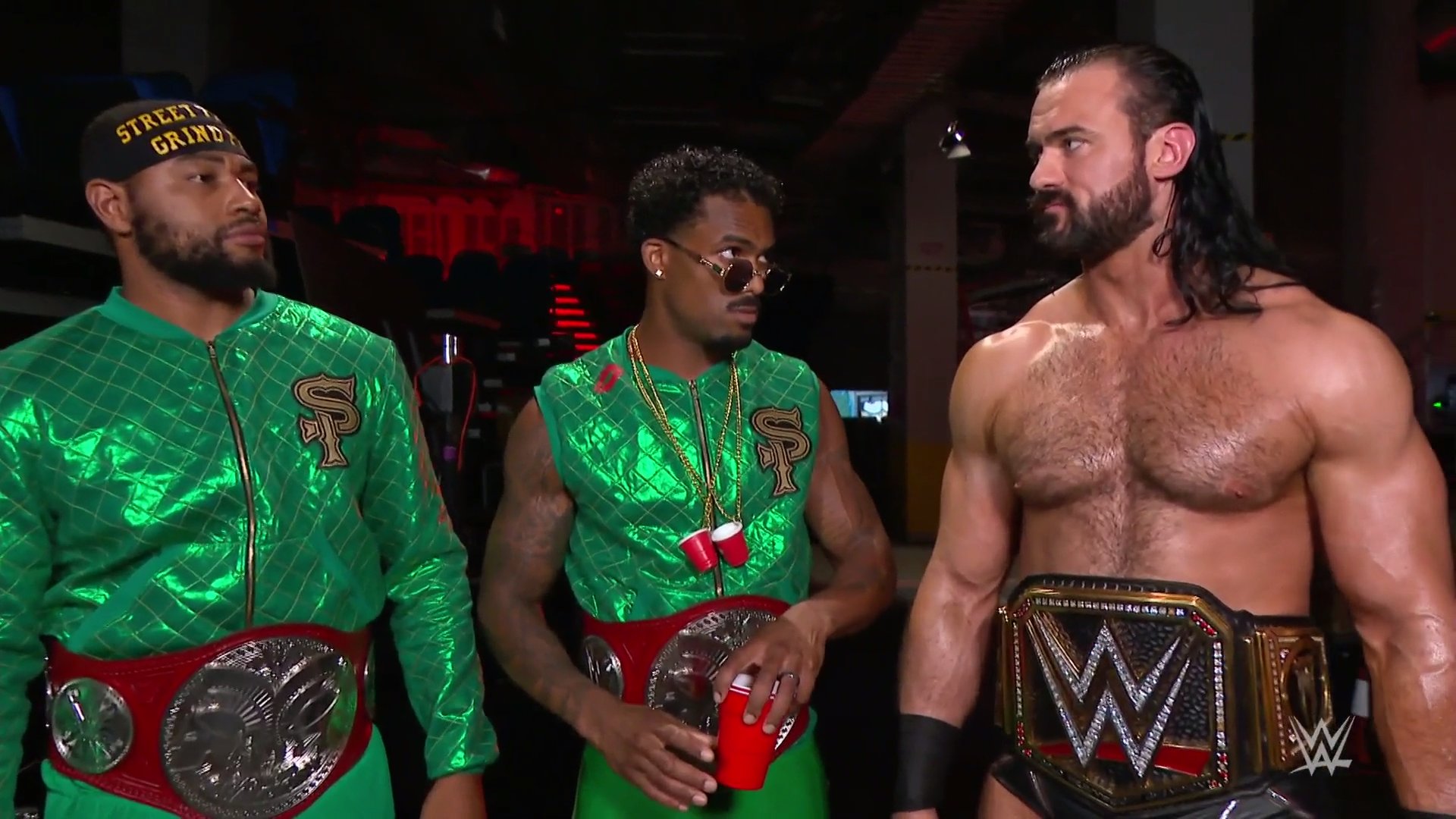 Tras bastidores, The Street Profits están listos para el evento estelar y dice que harán pagar a Randy Orton por lo que hizo la semana pasada. Drew McIntyre aparece y está de acuerdo con patearle el trasero a Orton.