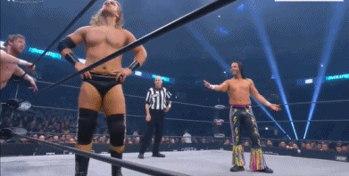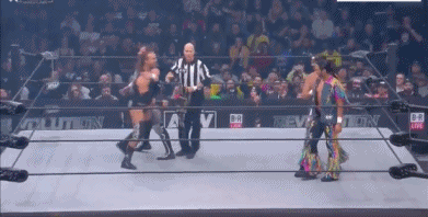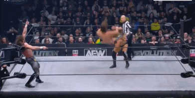 Omega y Hangman tienen ahora el control. Vuelan sobre Matt con moonsaults. Hangman aplica Fallaway Slam Desde las cuerdas a Nick para dos segundos. Luego un powerbomb y un V-Trigger de Omega. «¡A-E-W! ¡A-E-W!!» corean los fans»