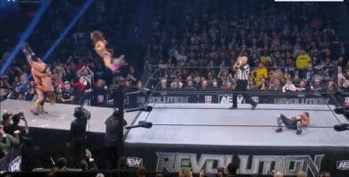 Sorprende al lanzarse en un moonsault desde el esquinero hacia los dos Bucks que estaban fuera del cuadrilátero.