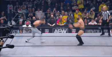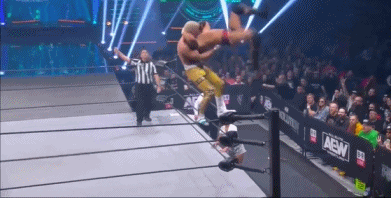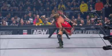 Cuando Cody tiene a MJF a su merced, toma vuelo corriendo hasta la escenografía de entrada para volver a toda velocidad, plantándole un lariat en el pecho al fifí.