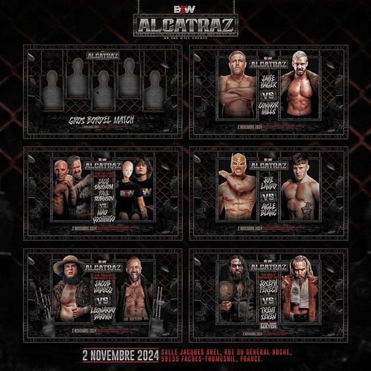 La empresa de lucha libre independiente, Banger Zone Wrestling, presentó su evento BZW Alcatraz, el cual tuvo lugar el 2 de noviembre 2024, desde Salle Jacques Brel en Faches-Thumesnil, Francia.