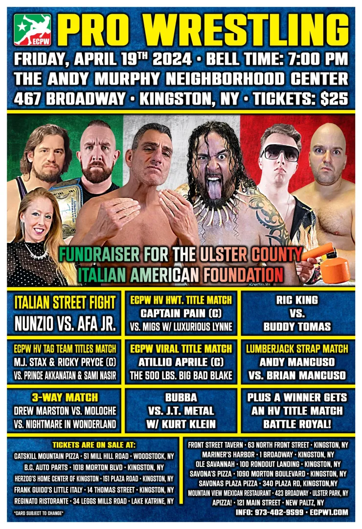 La empresa de lucha libre independiente, East Coast Pro Wrestling, presento su evento Fundraiser For The Ulster County Italian American Foundation, el cual tuvo lugar el 19 de abril 2024, desde Andy J. Murphy III Midtown Neighborhood Center en Kingston, New York, Estados Unidos.