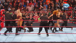 Apenas decreta el réferi el fin de la lucha, Rousey se va sobre Charlotte. Aparece el cuerpo de seguridad, pues las tres están imparables.