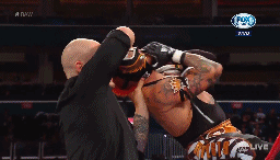 Todavía puede evitar el enmascarado una powerbomb, pero al ir al juego de cuerdas, recibe el Deep Six, con lo que pierde la batalla.