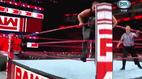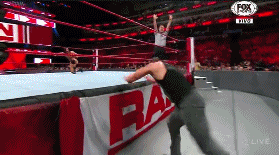 Pretende seguir con la misma tónica, pero al lanzarse desde las cuerdas, se estrella en la barrera de protección.