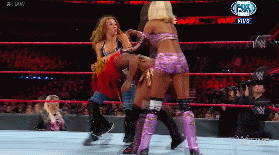 ¿Y quién es la que llega a aceptar el reto abierto? Suena la música de Natalya, pero no sale ella. Al menos no caminando. El Riott Squad la lleva arrastrando.