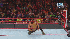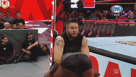 Owens, con una cara de furia desesperada, aplica powerbomb en la ceja del ring al moreno.