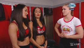 Las Bella Twins van al vestidor de Ronda Rousey, quizá para decirle que en su lucha en Super Show-Down Brie no se aventará en topes.