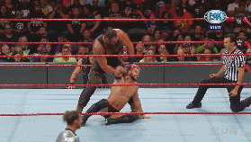 Después de un corte comercial, Strowman castiga el cuello del irlandés.