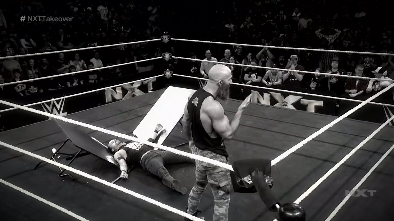 Cole sigue maltrecho. y Ciampa busca acomodar una mesa, pero Cole se recupera y logra aplicarle un suplex y golpea la cervical sobre la mesa. «Holy sh*t» corea el público, y Ciampa es ahora quien la pasa mal.