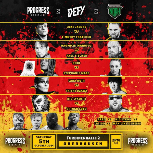 Seguidamente, los resultados completos de PROGRESS x DEFY x NOAH, celebrado desde el Turbinenhalle 2 de Oberhausen.