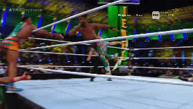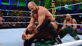 La acción se vuelve más veloz. Big E ayuda a Kingston a volar sobre Cesaro.