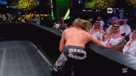 En lo alto de los esquineros, Orton intenta quitarle la máscara a Mysterio. Los comentaristas árabes reprueban al Viper.