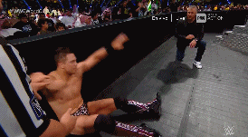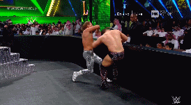 No pasa mucho tiempo antes de que Rollins saque del ring a Ziggler con un lazo al cuello. Luego baja para seguir golpeándolo y podemos ver los cómodos asientos de ringside.