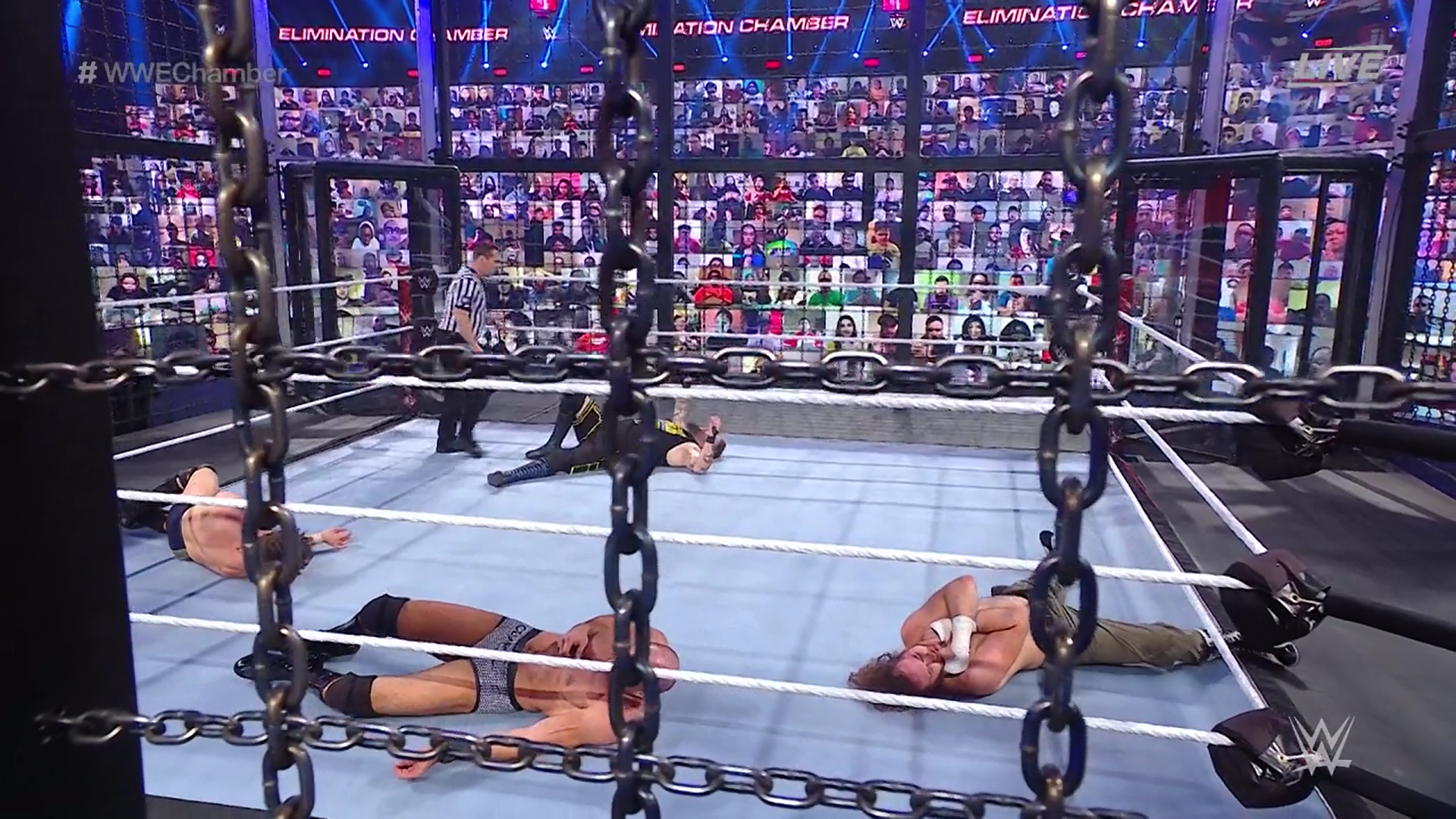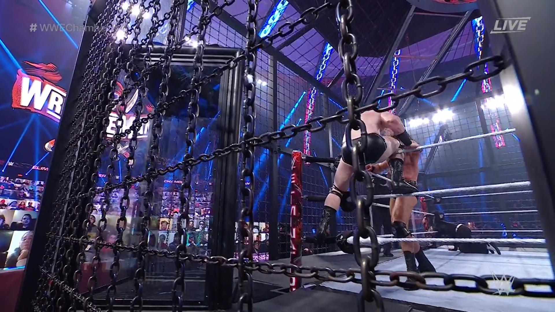 Con unas últimas impresiones de parte de los miembros del panel, el kickoff de WWE Elimination Chamber 2021 llega a su fin. Se anuncia que el primer encuentro será la cámara de la eliminación de las Superestrellas de SmackDown y la estructura está descendiendo.