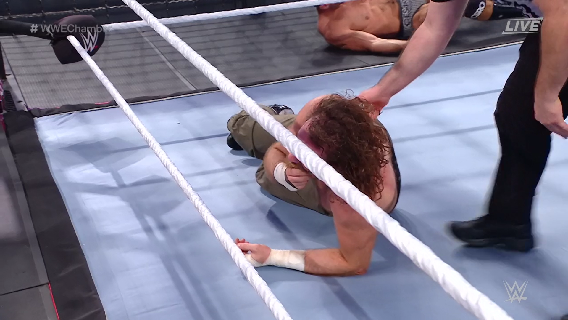 Cesaro intenta una breve ofensiva, pero Corbin lo manda para abajo de nuevo. Ahora enfoca su ataque en Daniel Bryan, el reloj llega a cero y el siguiente en ingresar es Sami Zayn, pero este se encierra en la estructura y no quiere salir. Bryan ataca a Corbin por detrás y este se estrella con el plexiglas. Sami respira tranquilo por ahora.