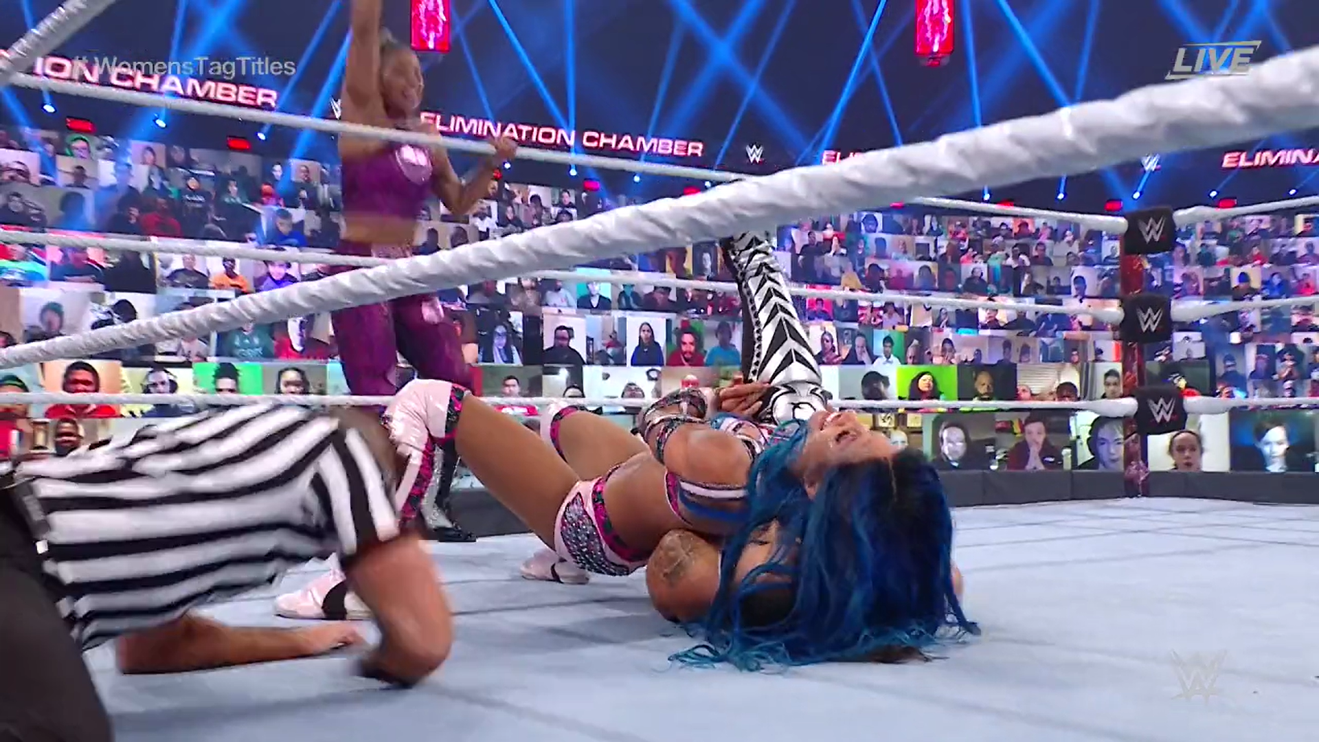 Sasha consigue una cuenta de dos con un Meteora, pero las rudas rápidamente recuperan el control e intercambian relevos a la vez que impiden que The Boss llegue a su esquina. Ahora la somete con una maniobra de rendición.