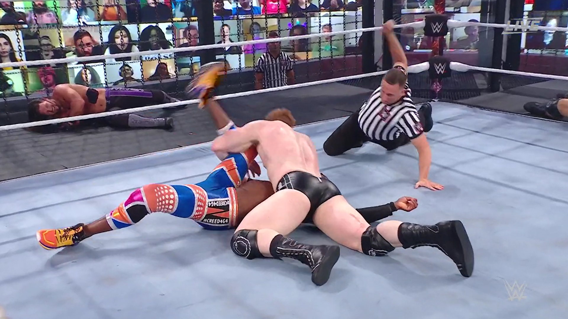Al reincorporarse, Kofi se lanza desde lo alto de un cubículo e impacta sobre sus rivales. Logra varias cuentas de dos sin éxito.