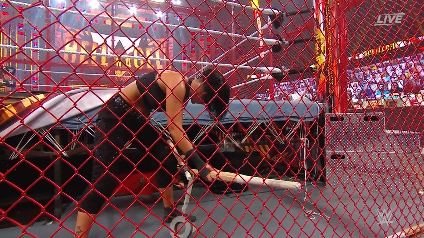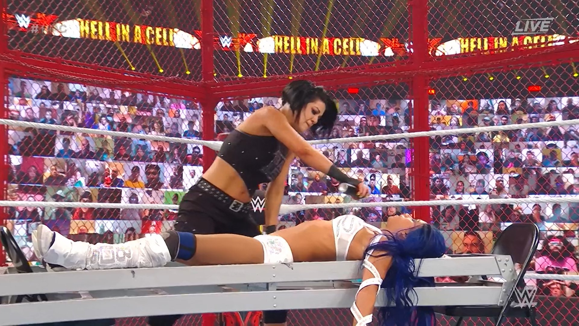 Bayley logra meter la silla que estaba fuera de la jaula, pero Sasha la sorprende y la ataca afuera del ring. Luego, la arroja por enésima vez contra las rejas metálicas.