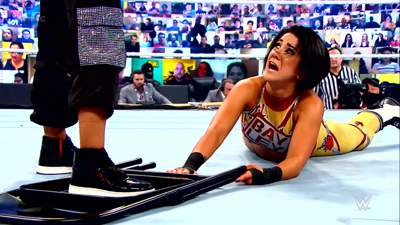 Bayley responde con un rodillazo y su versión del Bayley to Belly y consigue una cuenta de dos. Ambas están tendidas en el ring.