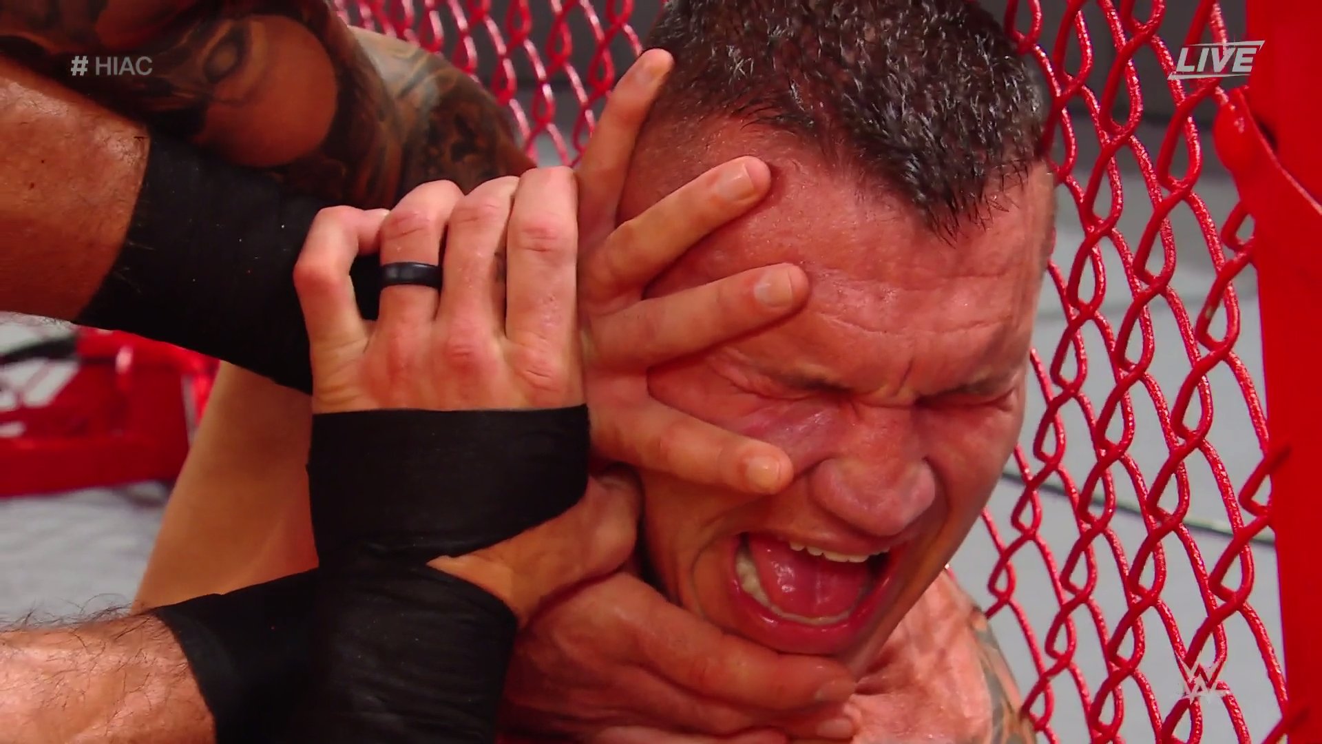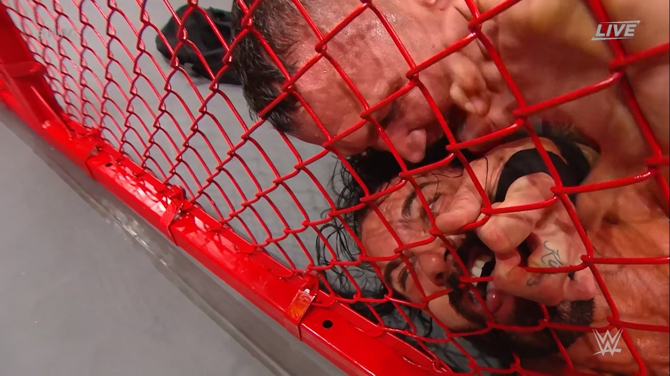 Parece que Orton no quiso esperar mucho, ya que apareció de incógnito para atacarlo, pero McIntyre estaba listo y ambos se dan con todo afuera de la jaula. Eventualmente, Orton toma la ventaja al arrojarlo contra las rejas, pero McIntyre replica y ambos intercambian golpes por todo el borde del ring.