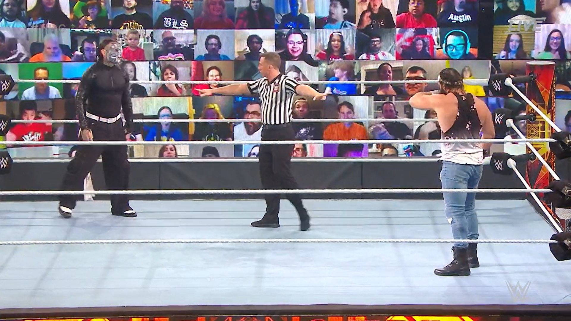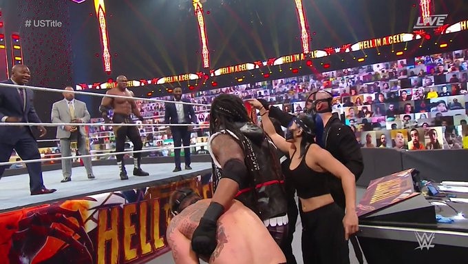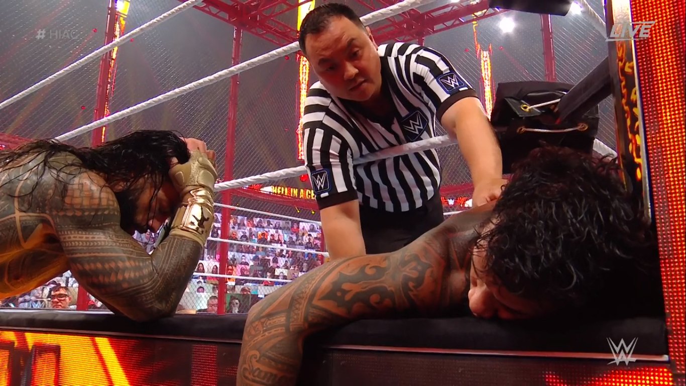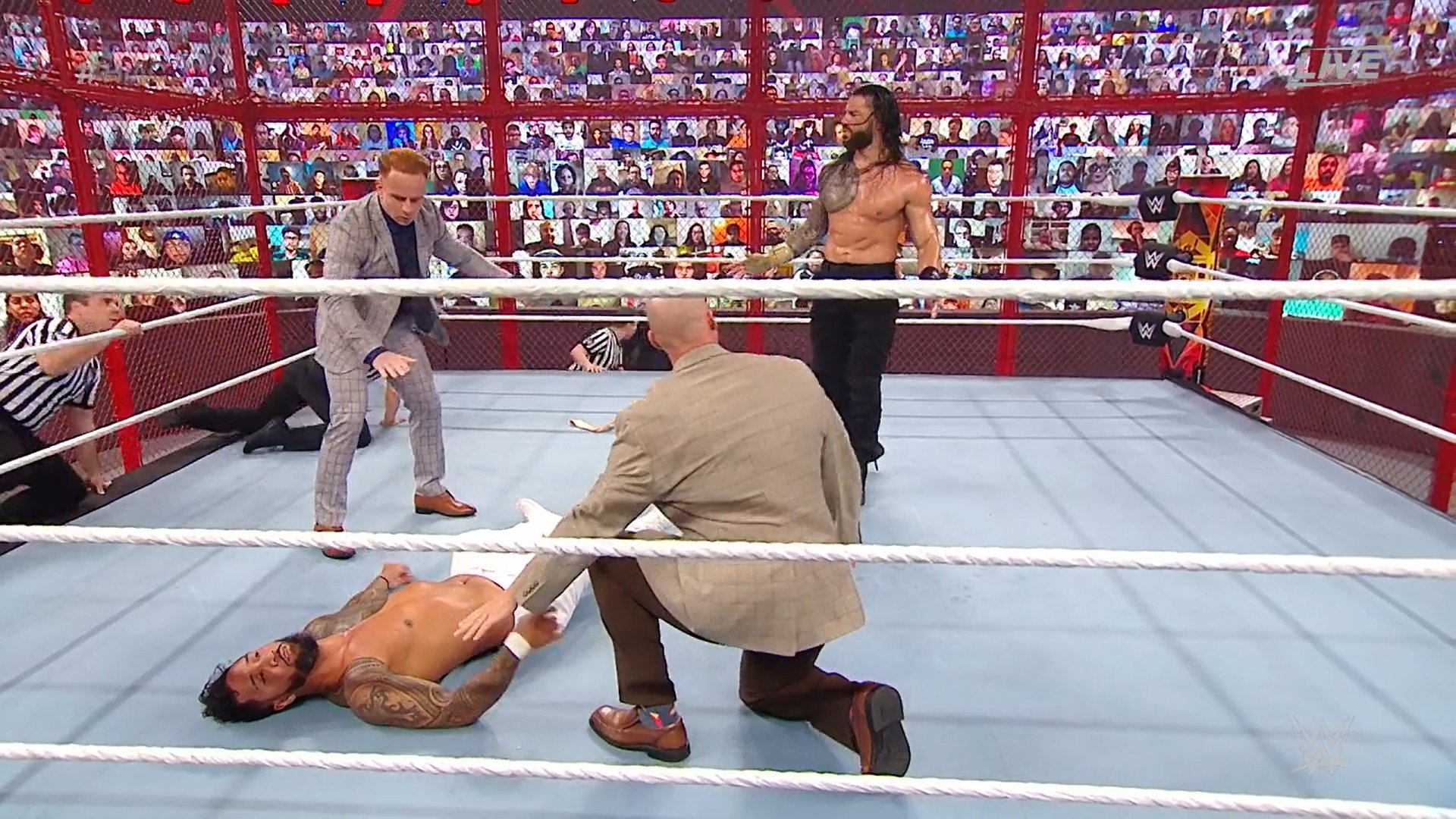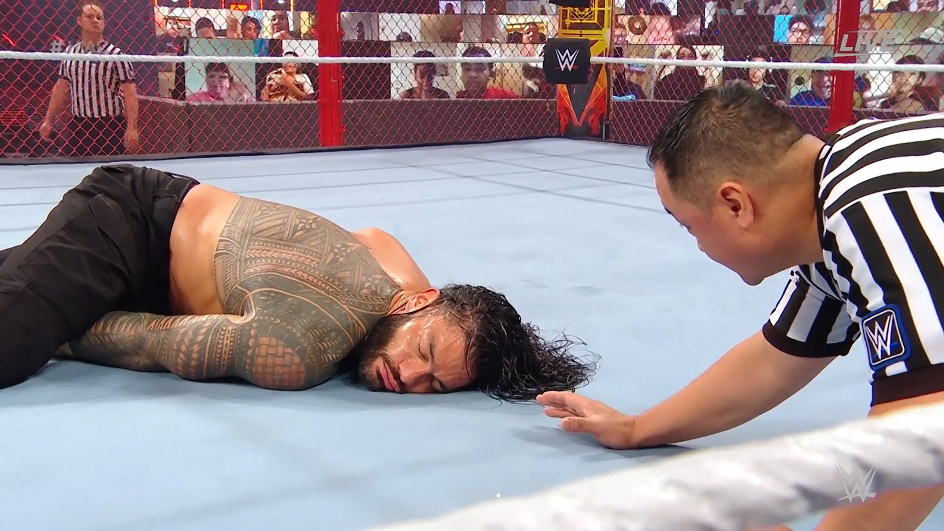 El réferi iba a suspender el combate y Reigns lo lanza contra la tercera cuerda. Reigns está furioso con todos, Heyman incluido. Ahora ingresan Adam Pearce y compañía a evitar más castigo.