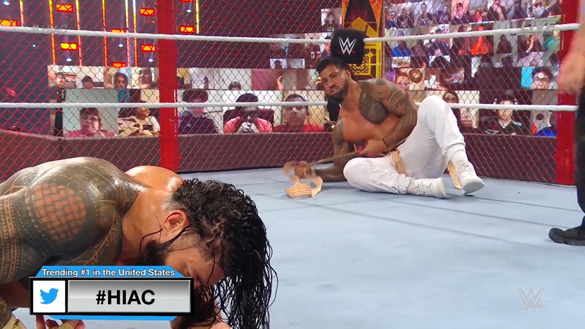 Jey resiste y conecta un derechazo, Roman responde y ahora ambos intercambian golpes. Reigns falla el Superman Punch y Jey utiliza la correa para intentar asfixiar a Reigns.