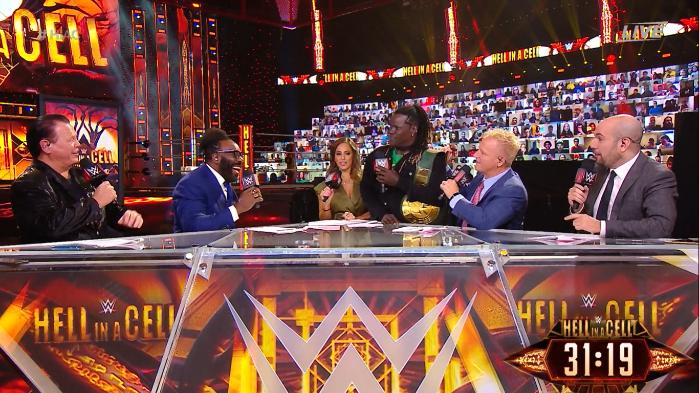 Charly Caruso nos da la bienvenida al kickoff de Hell in a Cell, acompañada de Booker T, Jerry Lawler, Jeff Jarrett y Peter Rosenberg.
