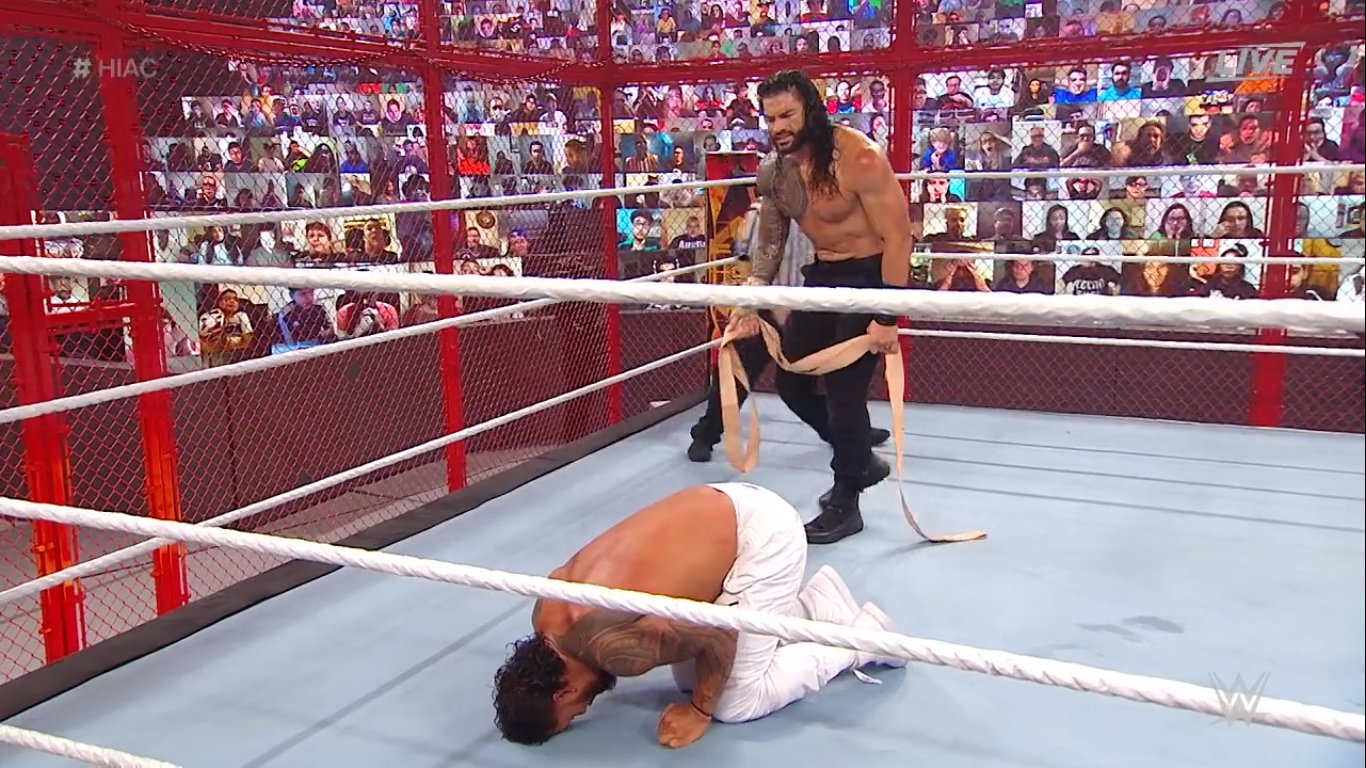 Jey se arma con una correa y azota a Reigns con la misma, pero Reigns lo castiga con una tercera lanza.
