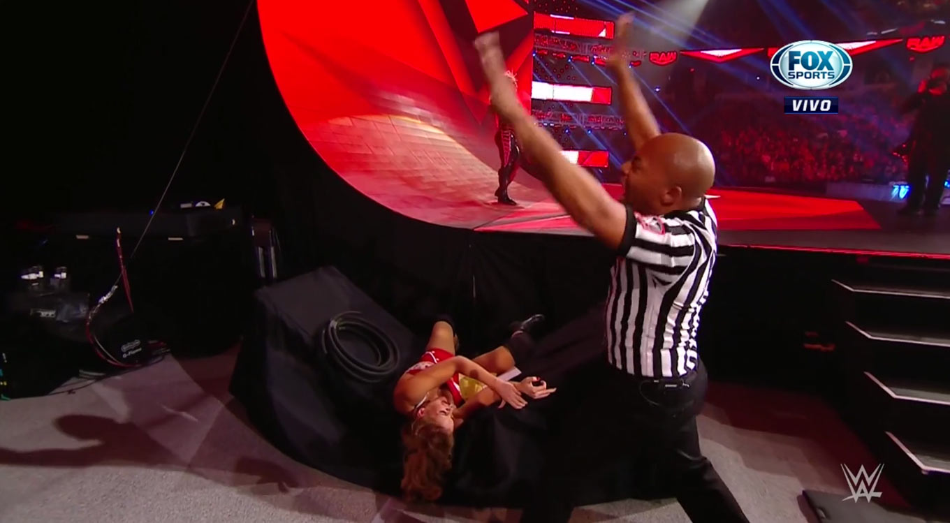 Bueno, el vacío no es muy hondo. Cayó sobre una mesa. El réferi termina la cuenta de diez y declara a Natalya como ganadora.