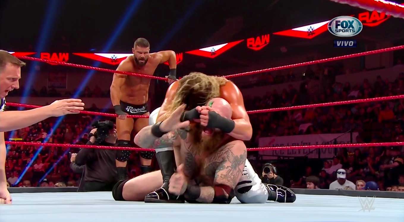Ziggler se sublima y puede conectarle el Fameasser a Ivar para dos segundos. Ivar se repone, lo derriba con una patada y va de nuevo por Erik para un castigo combinado. Roode rompe la cuenta de tres.