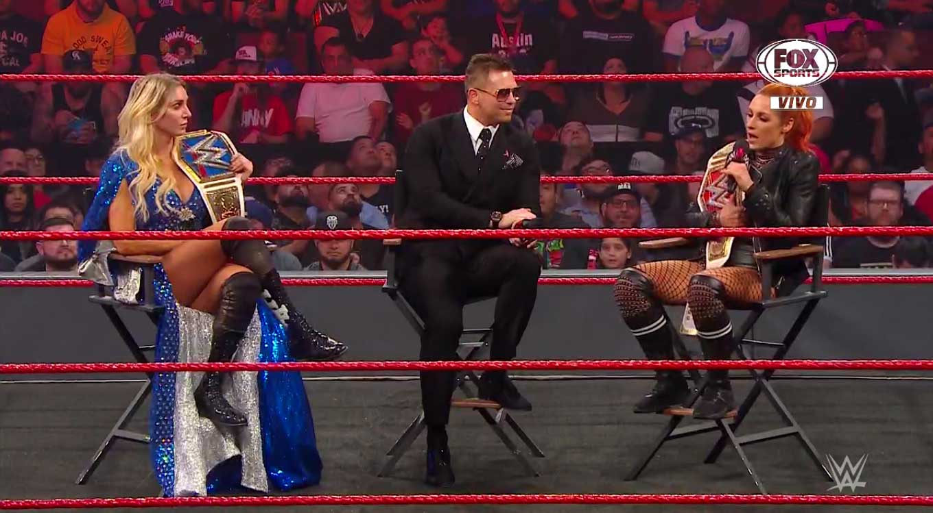 The Miz les pregunta sobre sus victorias la noche anterior. Becky dice que sigue adolorida de su lucha con Sasha Banks, pero si ella estuviera en la arena le volvería a patear el trasero.