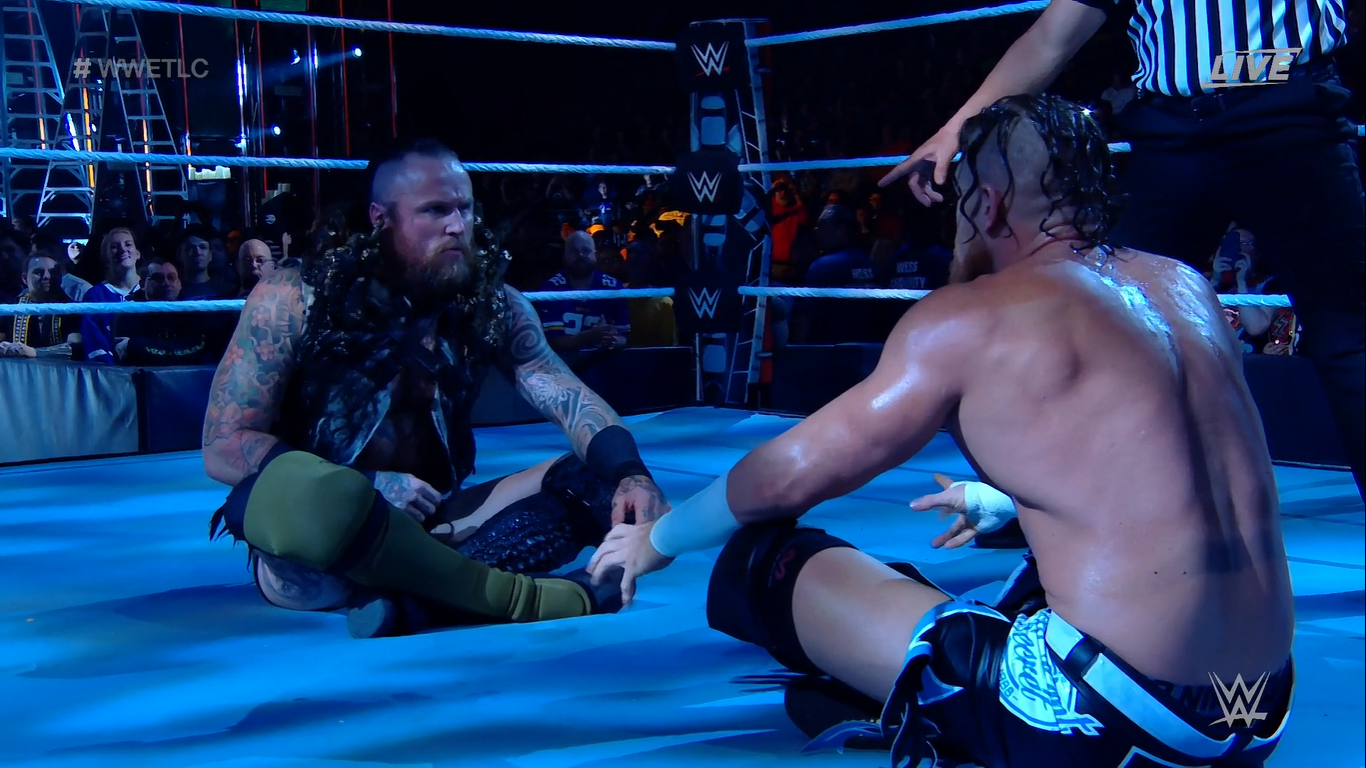 Gallows logra aplicarle un bombazo a Erik, y envía a Ivar afuera. Anderson e Ivar están fuera, Gallows les sigue, pero Erik también lo arroja afuera, aunque es enviado sobre la barrera. Ivar va por un tope desde el ring conectando con los retadores, pero los cuatro quedan tendidos en el suelo y el árbitro cuenta hasta 10.