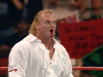 * En la foto del buen Gangrel, observamos como la sangre que bebes puede estar agria, o quizá afecte de manera inmediata a tu estomago. Mi teoría (porque ese combate no recuerdo), es que vio las «puppies» de Mae Young mientras el chocolate sexual Mark Henry le tapaba el cuerpo con su gigante cuerpo.