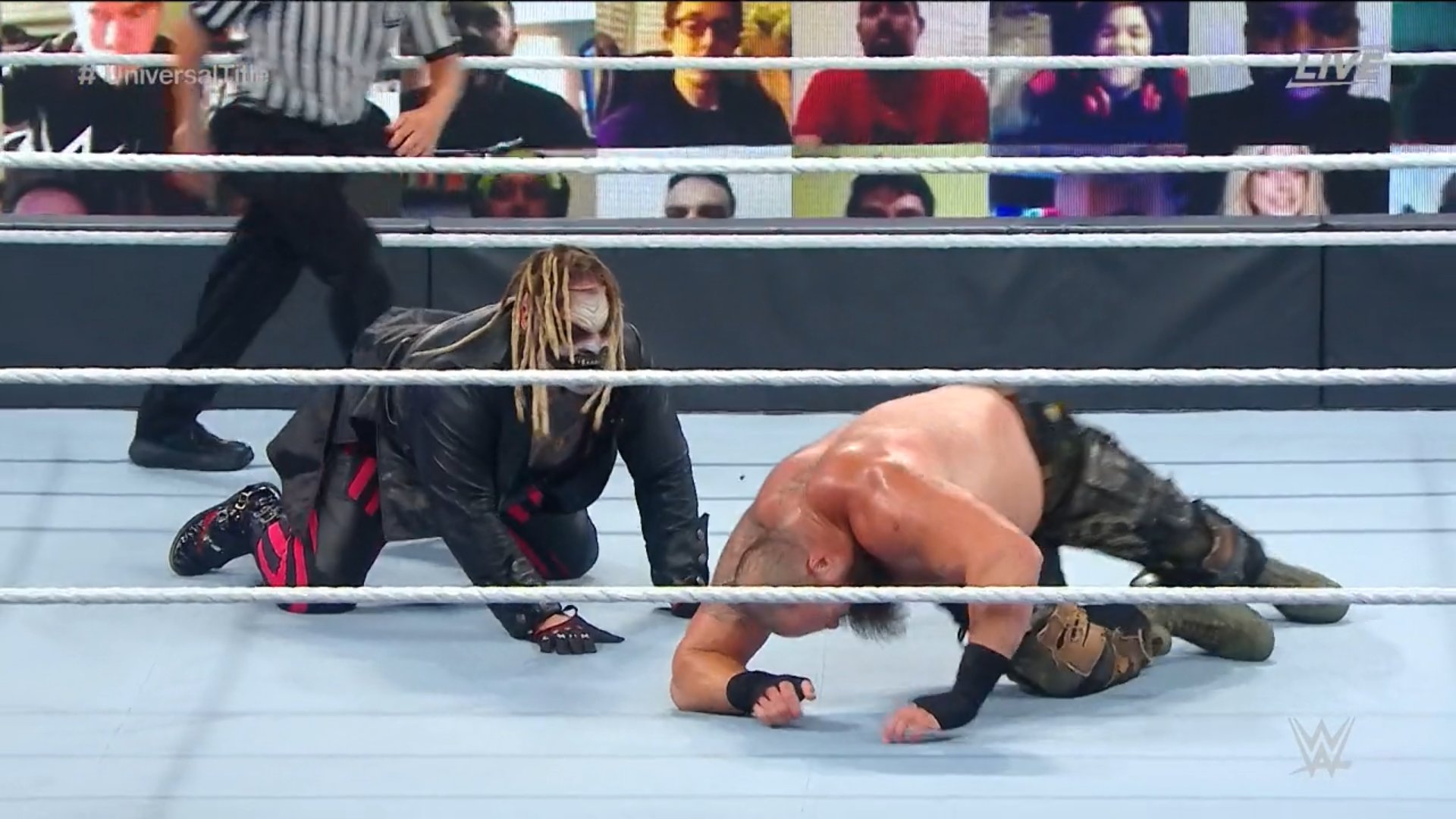 Strowman bloquea el Mandible Claw y le da duro a The Fiend… ¡Luego lo embsite con su gigante brazo y caen desde la rampa sobre unos colchones! Strowman está agotado, pero toma por la nuca a The Fiend y busca el camino de regreso al ring, Strowman cabecea a Fiend, quien le había dado un puñetazo en el estómago. Strowman mete al ring a The Fiend y luego camina hasta que decide subirse al esquinero. The Fiend aprovecha para recuperarse y darle duro a Strowman, ambos se dan cabezazos, Strowman pierde… ¡The Fiend busca un Superplex! ¡Y EL RING SE DESBARATA! ¡El ring se desbarata con el Superplex que le hizo The Fiend a Braun Strowman!