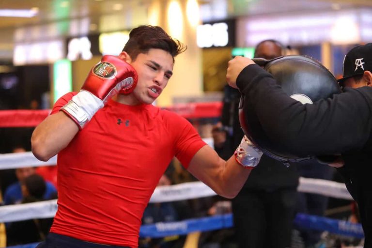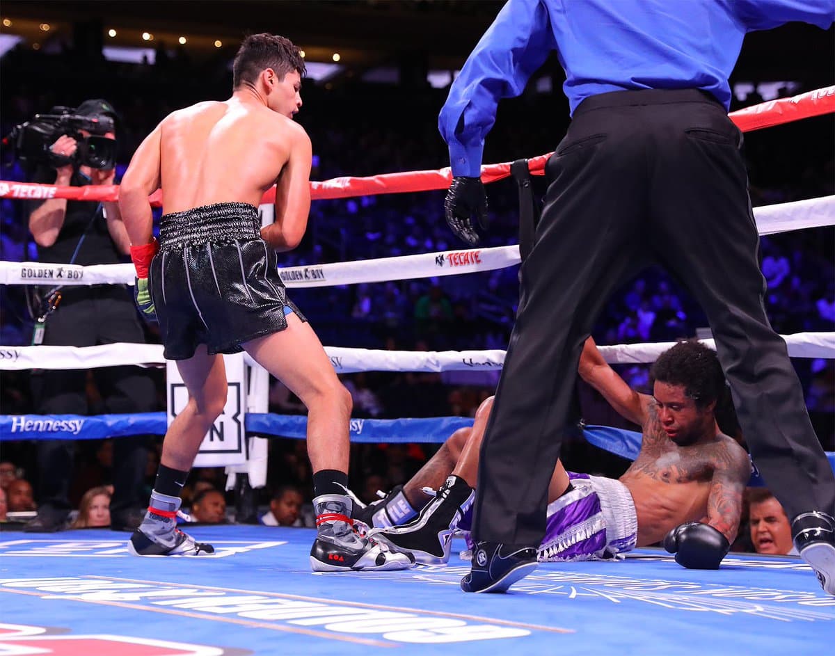 Y por eso Ryan García noqueó, porque su rival se encerró en una huída y recibió una andanada de golpes. Se fue al piso y salió del encordado.