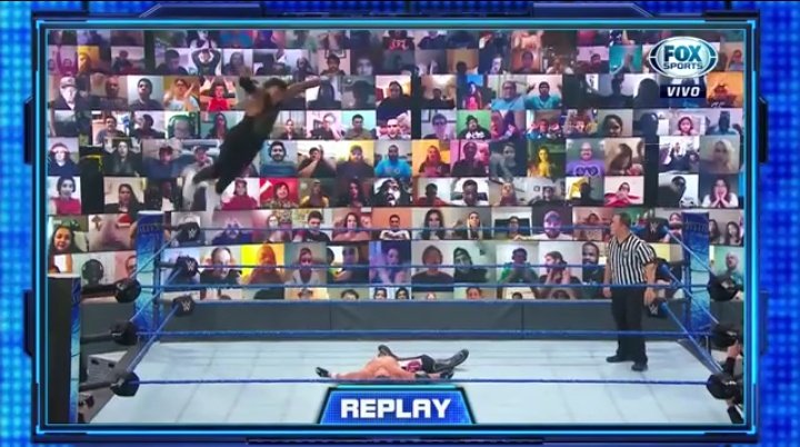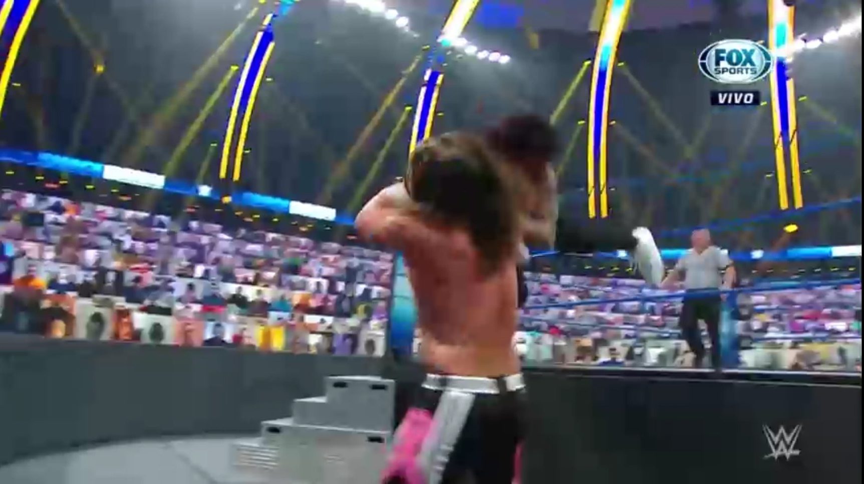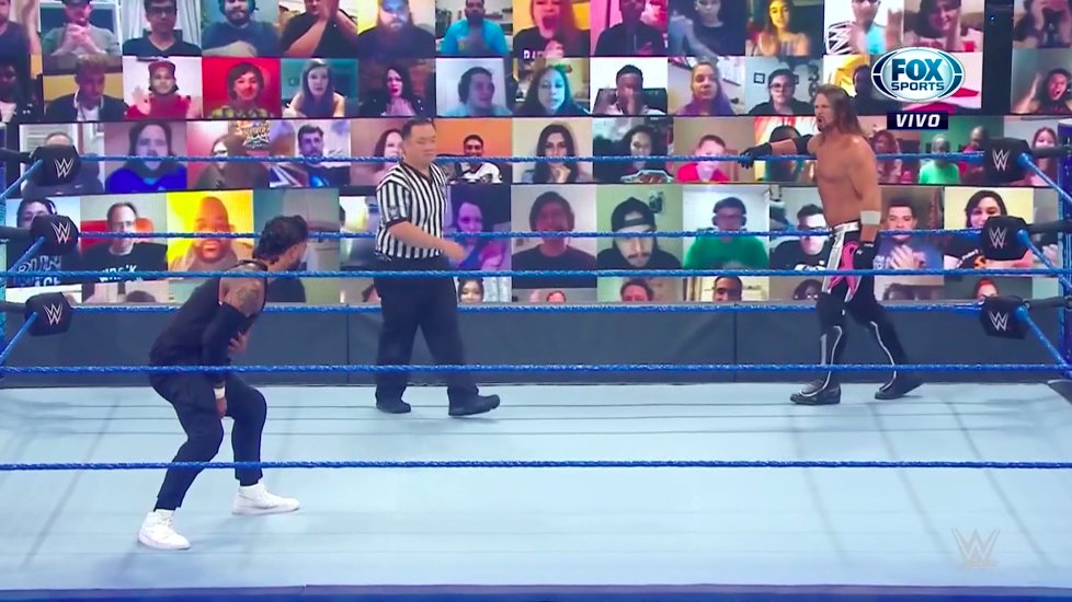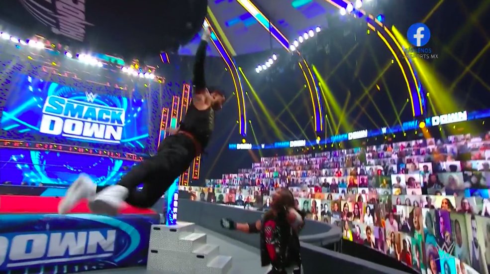 Jey toma impulso para lanzarse en tope, pero es recibido con un golpe de antebrazo de Styles y queda tendido sobre la cuerda intermedia. Styles aprovecha la situación y consigue aplicar un Suplex sobre la mesa de comentaristas.