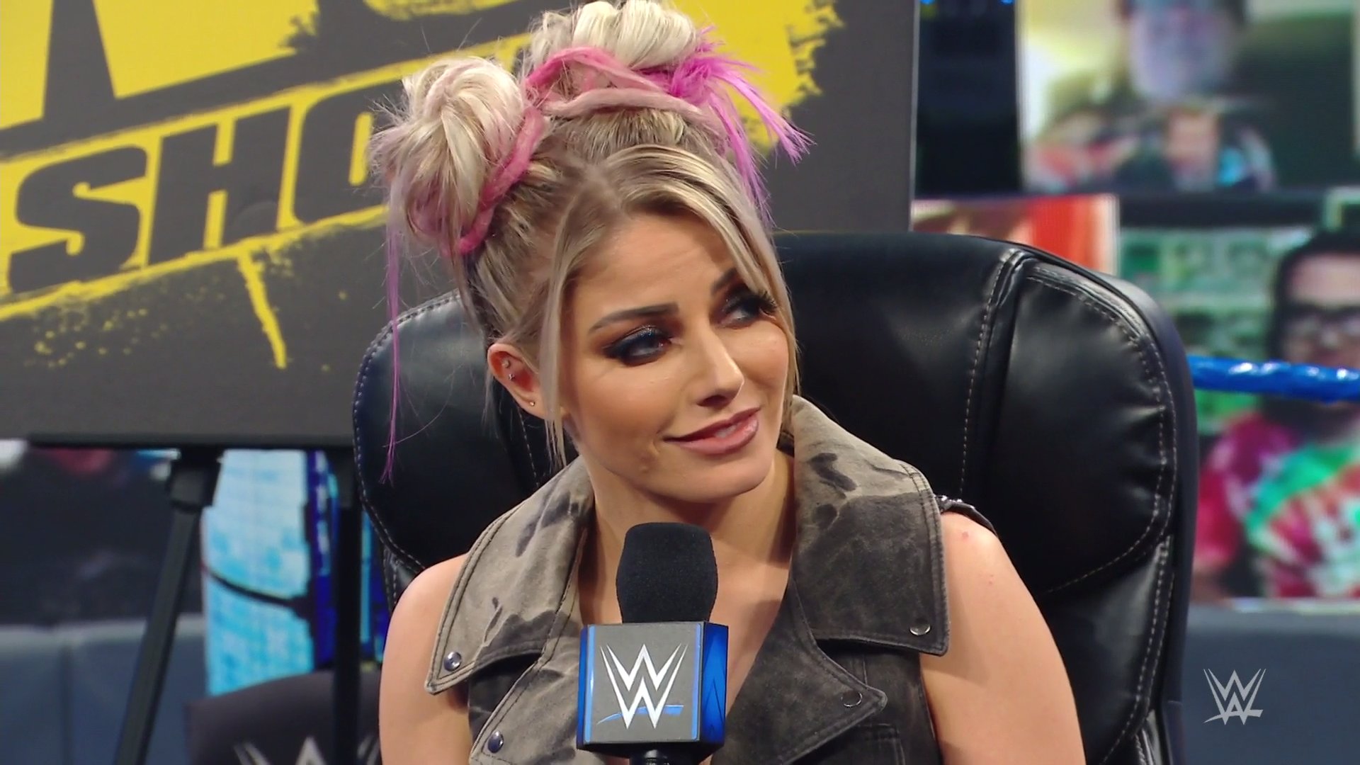 Dice que pese a ser una Superestrella de Raw, está muy pendiente de SmackDown, especialmente, de quien será su invitada esta noche. Sin más preámbulos, Alexa Bliss aparece.